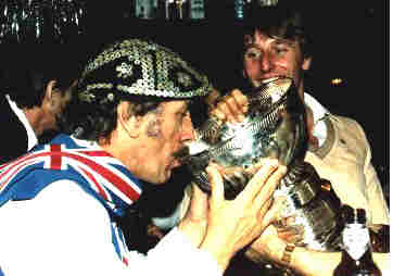 Drinking champagne from the Stanley cup in Edmonton, Alberta, when they won it thanks to Sather and Gretsky.